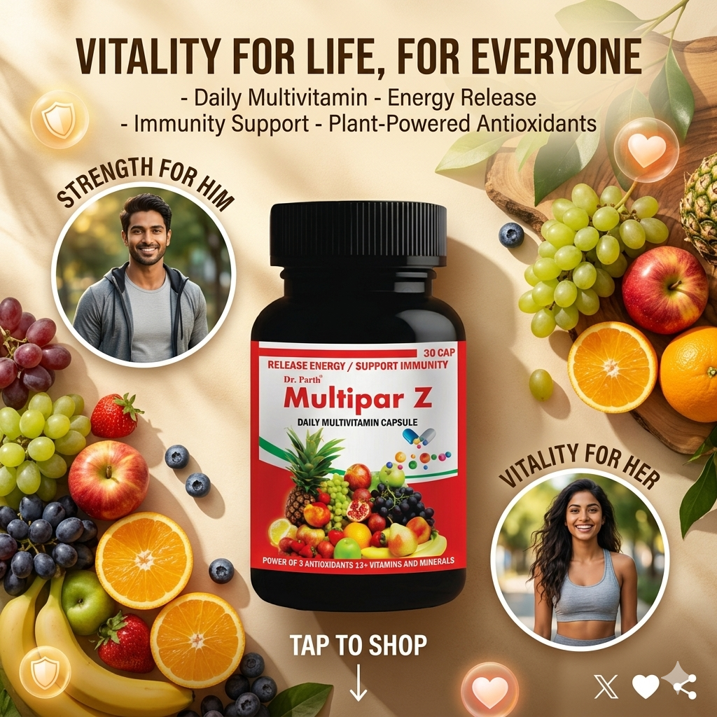 Multipar-Z Capsules by Dr Parth Biotech are a powerful daily multivitamin and mineral supplement designed to support overall health, immunity, and energy levels. This advanced formula contains 13+ essential vitamins, minerals, and antioxidants that help the body stay active, healthy, and protected.